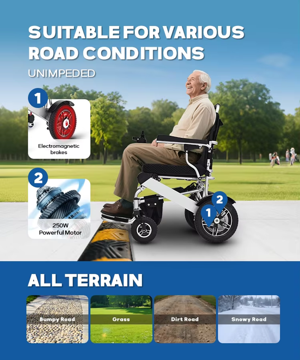 La RPW-101 Elite es la cumbre de la innovación en sillas de ruedas eléctricas. Diseñada con un marco de aluminio AL6061 de grado aeroespacial y equipada con motores sin escobillas de onda sinusoidal de 250 W. Esta silla ofrece una conducción suave, potente y silenciosa, incluso en condiciones exigentes.