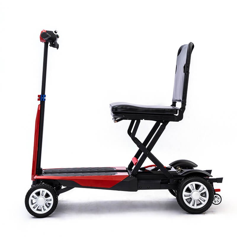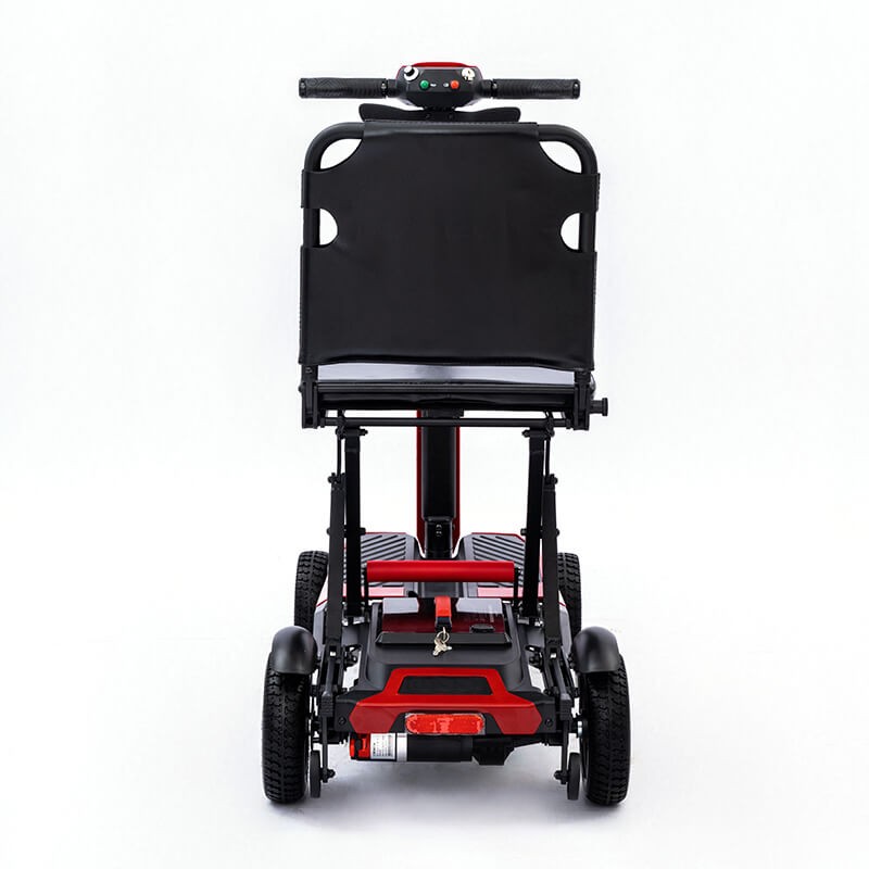 El RMS-102 es ideal para cualquier tipo de viaje y transporte. Funciona con una batería de litio compatible con aerolíneas, que ofrece una autonomía de 24 km. Se pliega fácilmente a mano gracias a su asa roja.