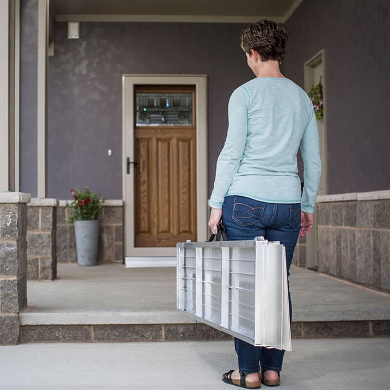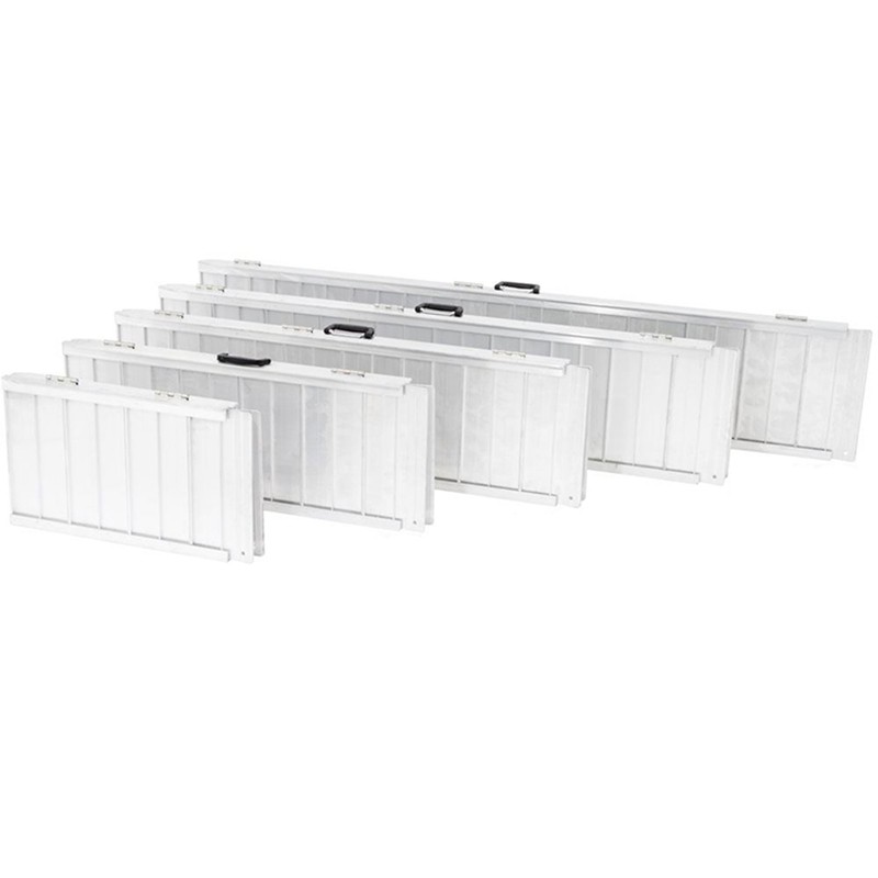 La FSR001 es una rampa portátil de un solo pliegue, se instala rápidamente y es ideal para sillas de ruedas y scooters. Fabricada en aluminio ligero y fácil de transportar, esta rampa plegable para maletas cuenta con asas ergonómicas y una bisagra completa para mayor resistencia y estabilidad. Su construcción ligera de aluminio, su práctico diseño plegable y la posibilidad de dividirla en dos mitades fáciles de transportar garantizan que pueda llevarla a cualquier lugar y guardarla con la misma facilidad.