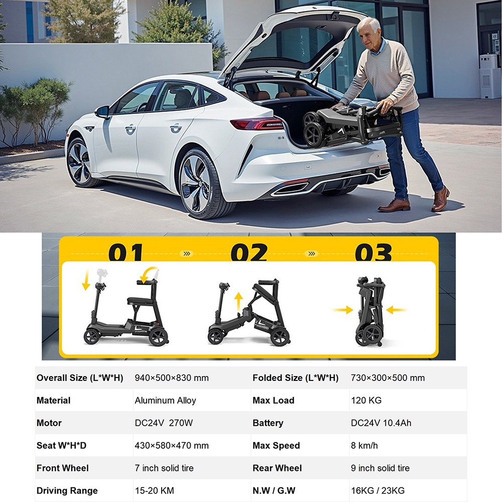 Peso neto: 16 kg. Carga máxima: 120 kg. Autonomía: 15 km.